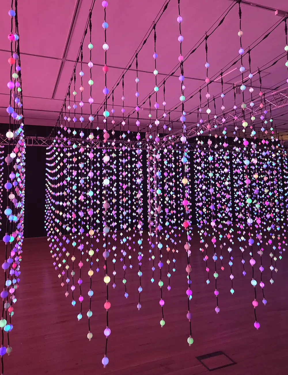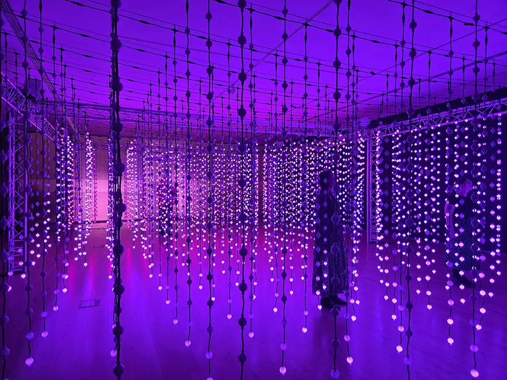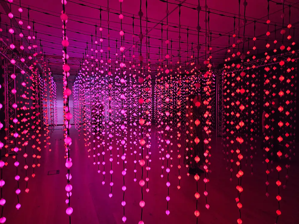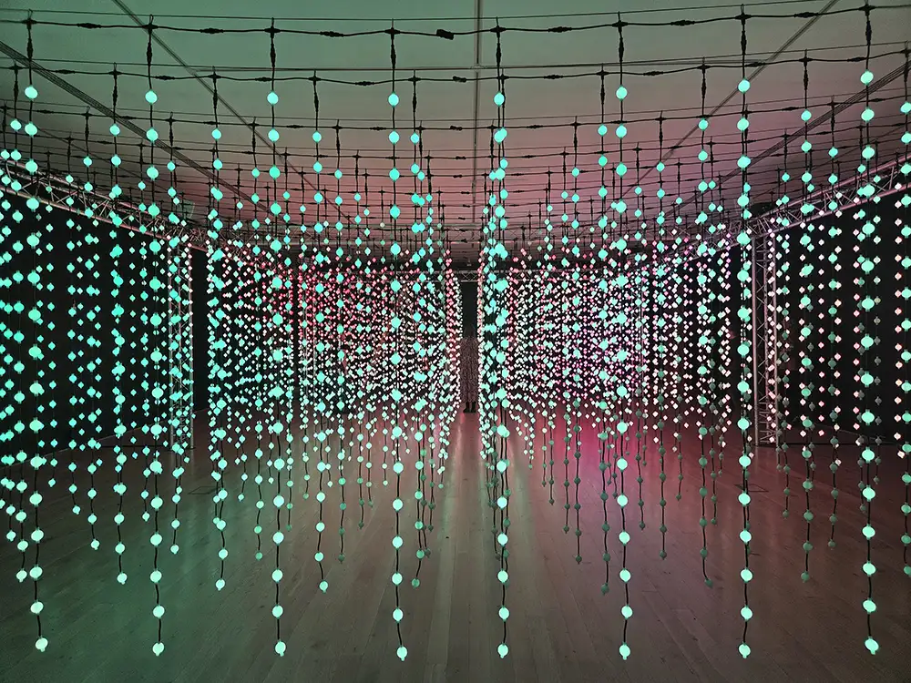 Submergence is an immersive work that features over 8,000 individually suspended LEDs, providing a sensory experience unfolding over a 12-minute rotation. Visitors can walk through and touch the suspended LEDs and interact with the art piece.