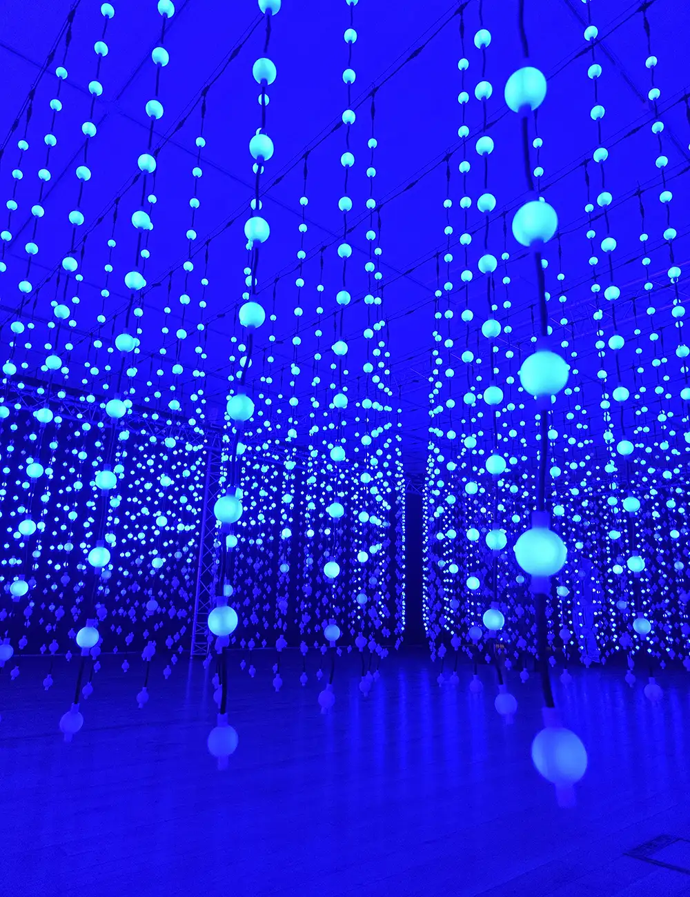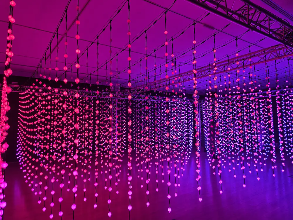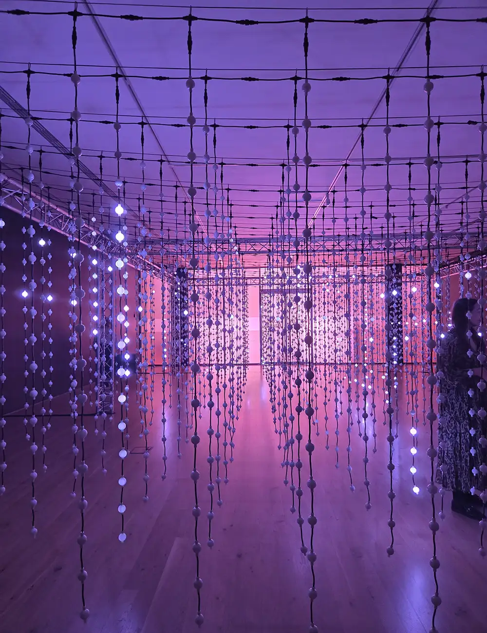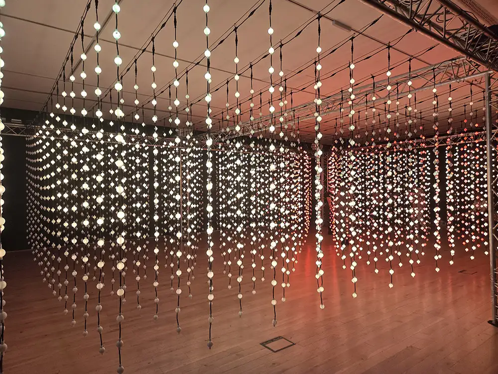 Submergence is an immersive work that features over 8,000 individually suspended LEDs, providing a sensory experience unfolding over a 12-minute rotation. Visitors can walk through and touch the suspended LEDs and interact with the art piece.