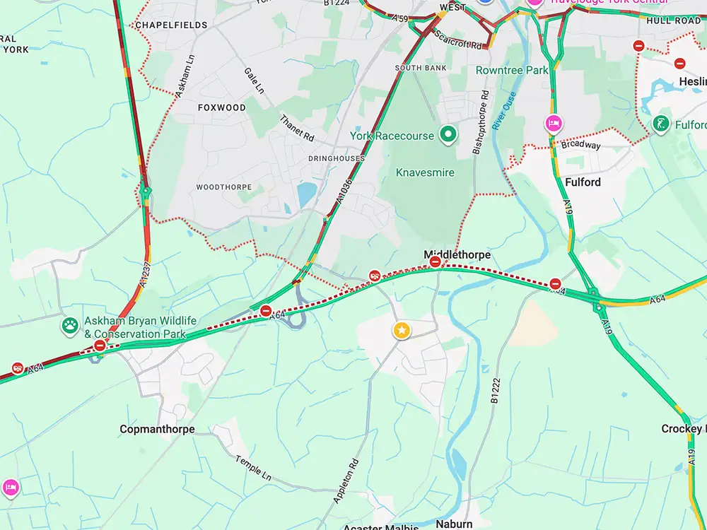 “The eastbound closure was extended to the A1237 (Askham Bryan) to facilitate the strategic diversion route.”.