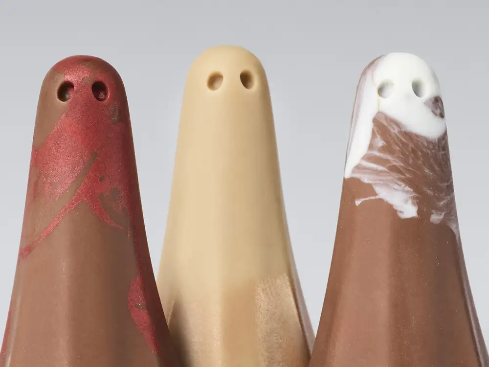 The trio of ghosts will come in three different types: a Solid Swiss Milk Chocolate with naturally coloured red cocoa butter design, a Solid Blond Chocolate Ghost with hand finished gold lustre, and Solid Swiss Milk Chocolate with naturally coloured white cocoa butter design.