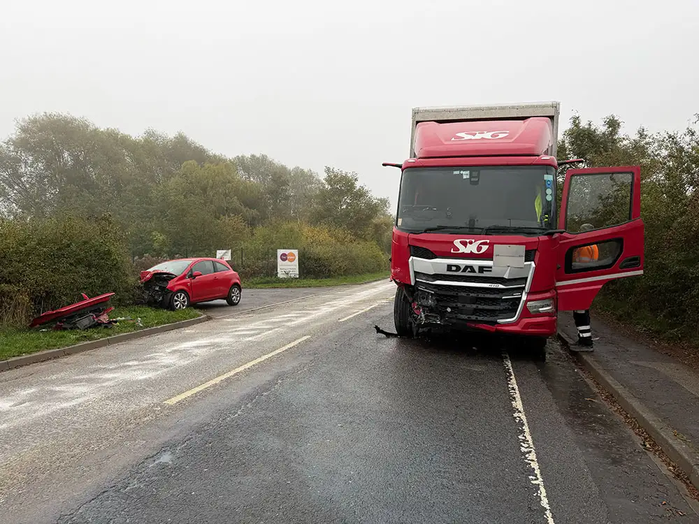 The front of the Corsa was very badly damaged. The lorry also sustained some serious damage to its front.