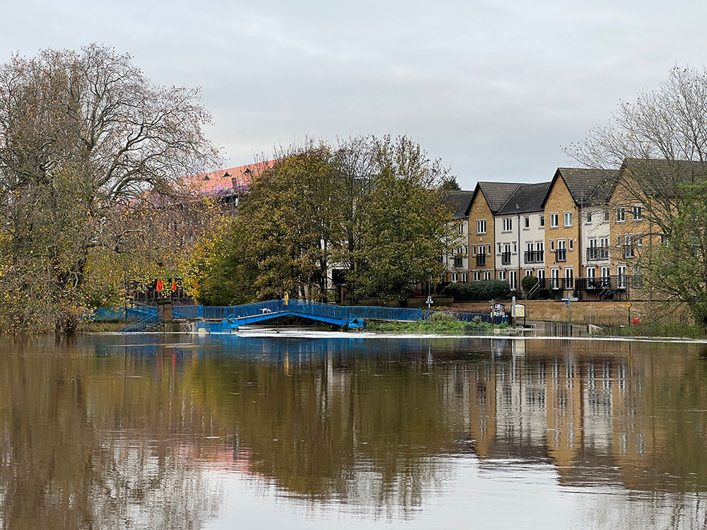 The water has encroached on some of the paths on the other side of the Ouse. The Blue Bridge is still accessible.