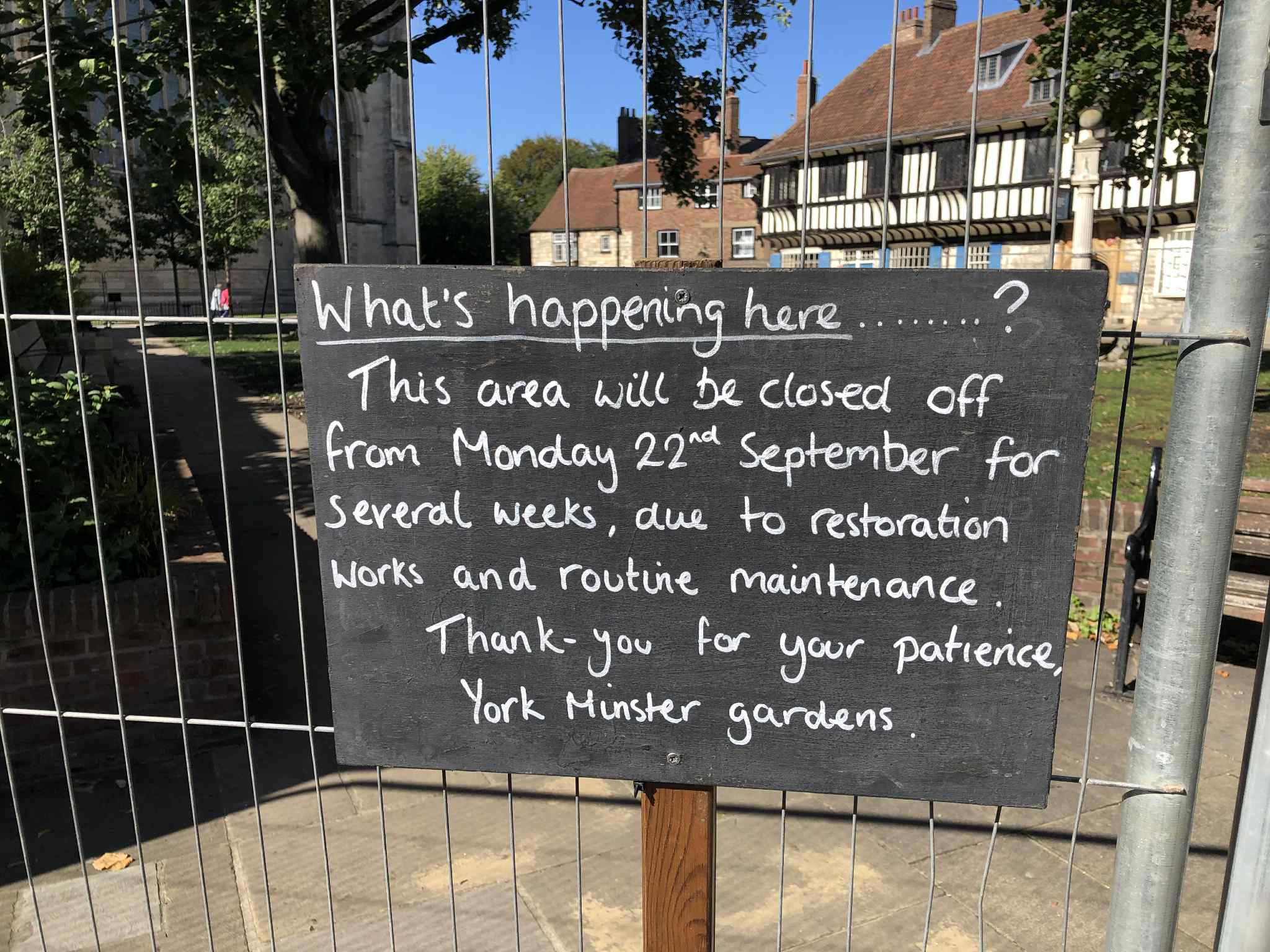 The Minster Gardens Team have put a notice up saying its for restoration and routine maintenance. It will allow the grass to recover from the heavy footfall of the season.