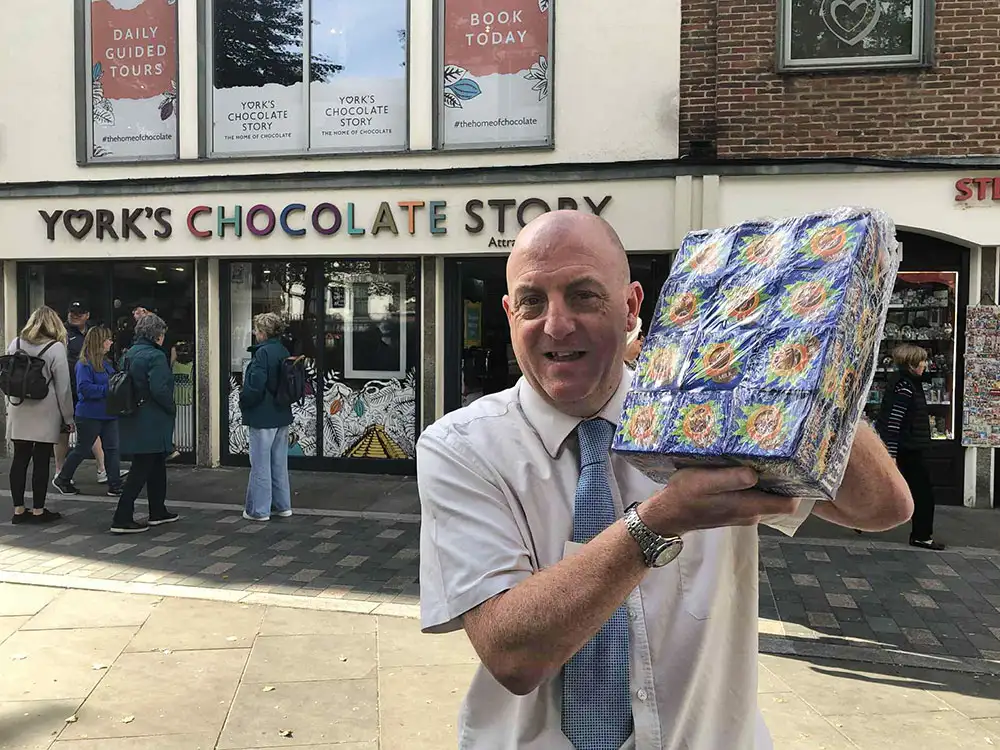 “It’s something we won’t be doing. We won’t be opening it. We’ll be leaving it as it is in its cling film and celebrating history and heritage of chocolate in York.”